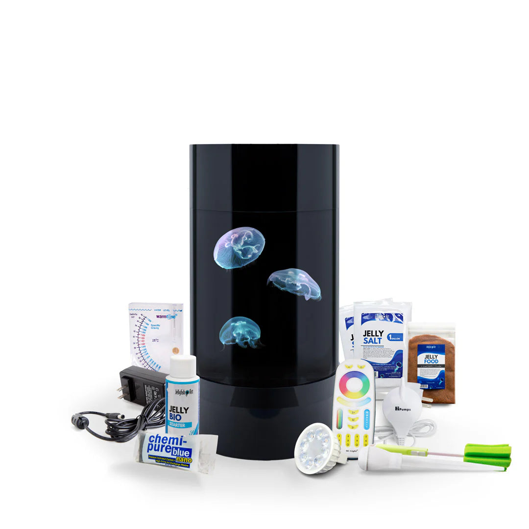 The Jelly Cylinder Nano Kit® Includes 3 small sustainably aquacultured live moon jellyfish, jellyfish food, and everything you need to set up the aquarium.